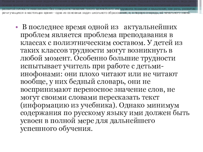 В последнее время одной из актуальнейших проблем является проблема преподавания в классах с полиэтническим составом. У детей из таких классов трудности могут возникнуть в любой момент. Особенно большие трудности испытывает учитель при работе с детьми- инофонами: они плохо читают или не читают вообще, у них бедный словарь, они не воспринимают переносное значение слов, не могут своими словами пересказать текст (информацию из учебника). Однако минимум содержания по русскому языку ими должен быть усвоен в полной мере для дальнейшего успешного обучения.