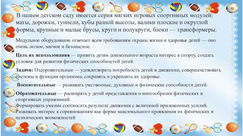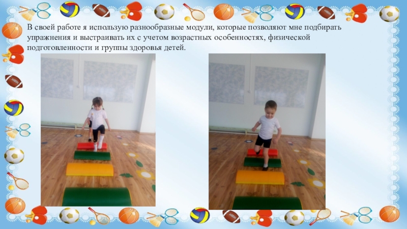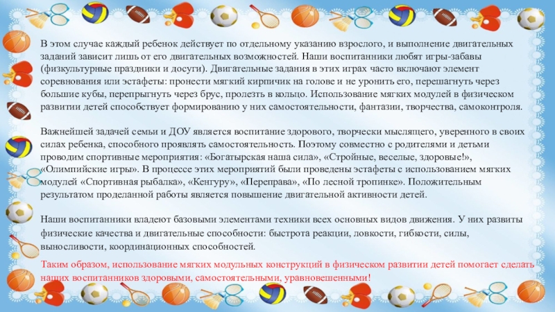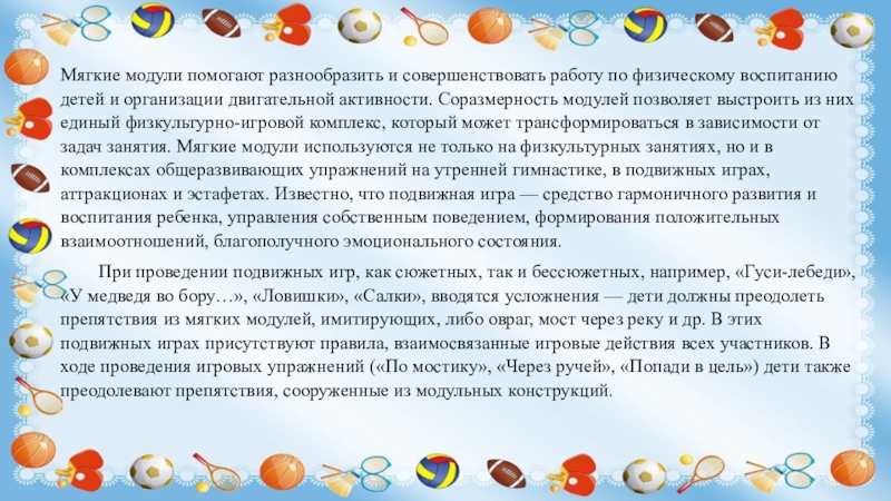 Слайд 5Мягкие модули помогают разнообразить и совершенствовать работу по физическому воспитанию детей