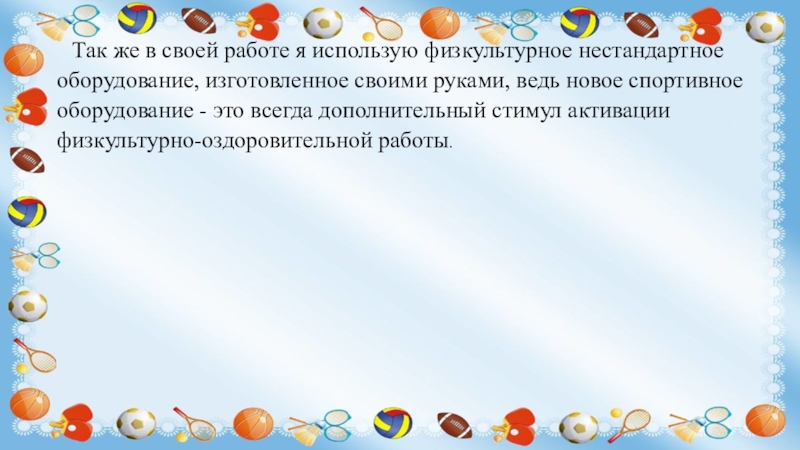 Слайд 11Так же в своей работе я использую физкультурное нестандартное оборудование, изготовленное