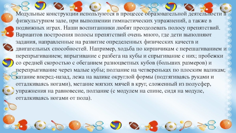 Слайд 4Модульные конструкции используются в процессе образовательной деятельности в физкультурном зале, при
