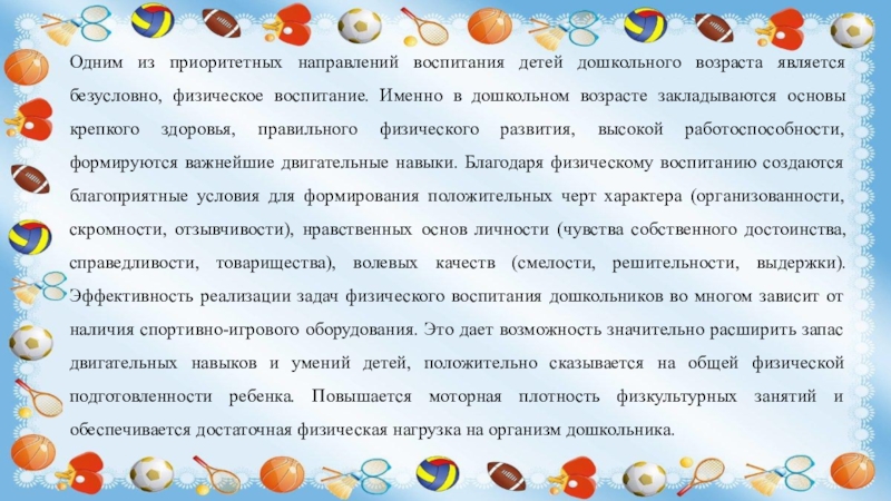 воспитание. Именно в дошкольном возрасте закладываются основы крепкого здоровья, правильного физического развития, высокой работоспособности, формируются важнейшие двигательные навыки. Благодаря физическому воспитанию создаются благоприятные условия для формирования положительных черт характера (организованности, скромности, отзывчивости), нравственных основ личности (чувства собственного достоинства, справедливости, товарищества), волевых качеств (смелости, решительности, выдержки). Эффективность реализации задач физического воспитания дошкольников во многом зависит от наличия спортивно-игрового оборудования. Это дает возможность значительно расширить запас двигательных навыков и умений детей, положительно сказывается на общей физической подготовленности ребенка. Повышается моторная плотность физкультурных занятий и обеспечивается достаточная физическая нагрузка на организм дошкольника.