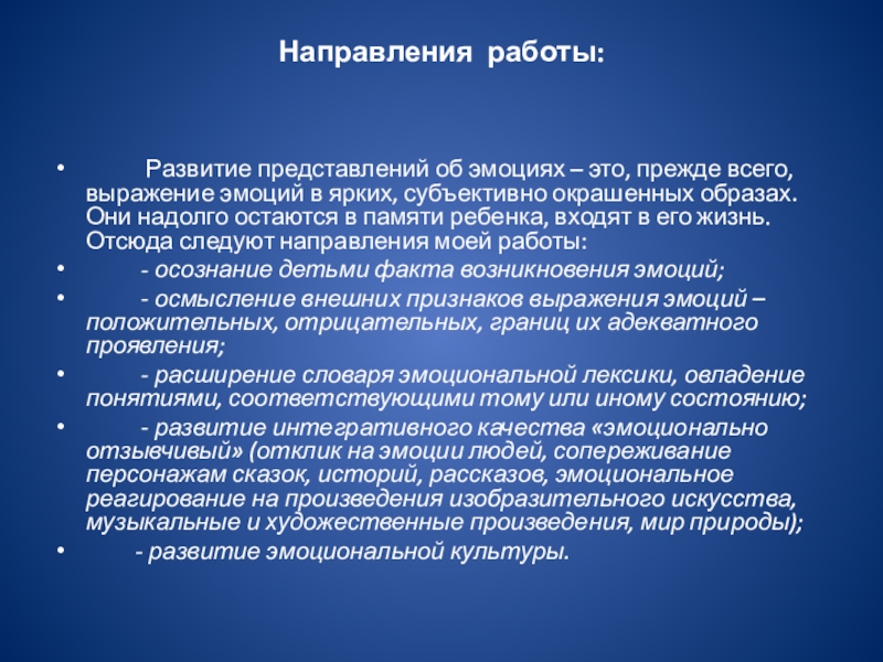 это, прежде всего, выражение эмоций в ярких, субъективно окрашенных образах. Они надолго остаются в памяти ребенка, входят в его жизнь. Отсюда следуют направления моей работы: