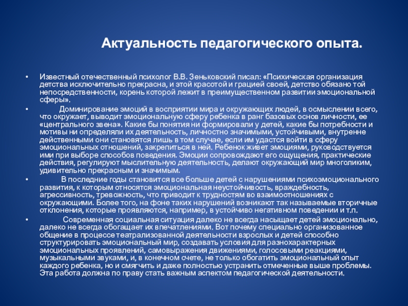 Зеньковский писал: «Психическая организация детства исключительно прекрасна, и этой красотой и грацией своей, детство обязано той непосредственности, корень которой лежит в преимущественном развитии эмоциональной сферы».