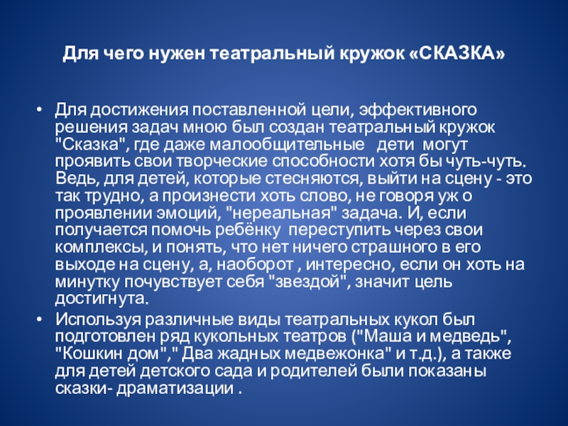 задач мною был создан театральный кружок "Сказка", где даже малообщительные дети могут проявить свои творческие способности хотя бы чуть-чуть. Ведь, для детей, которые стесняются, выйти на сцену - это так трудно, а произнести хоть слово, не говоря уж о проявлении эмоций, "нереальная" задача. И, если получается помочь ребёнку переступить через свои комплексы, и понять, что нет ничего страшного в его выходе на сцену, а, наоборот , интересно, если он хоть на минутку почувствует себя "звездой", значит цель достигнута.