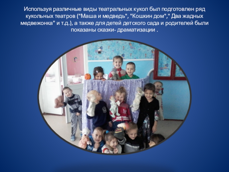Используя различные виды театральных кукол был подготовлен ряд кукольных театров ("Маша и медведь", "Кошкин дом"," Два жадных медвежонка" и т.д.), а также для детей детского сада и родителей были показаны сказки- драматизации .