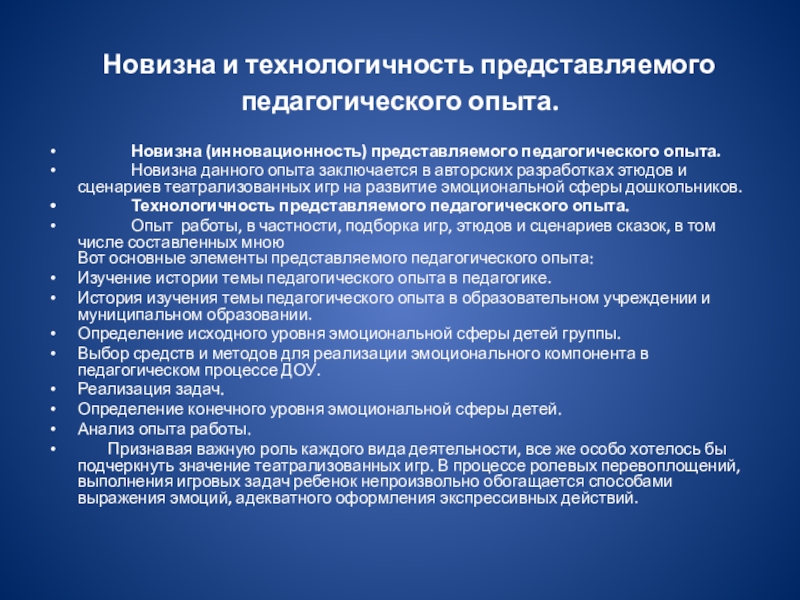 Новизна данного опыта заключается в авторских разработках этюдов и сценариев театрализованных игр на развитие эмоциональной сферы дошкольников.