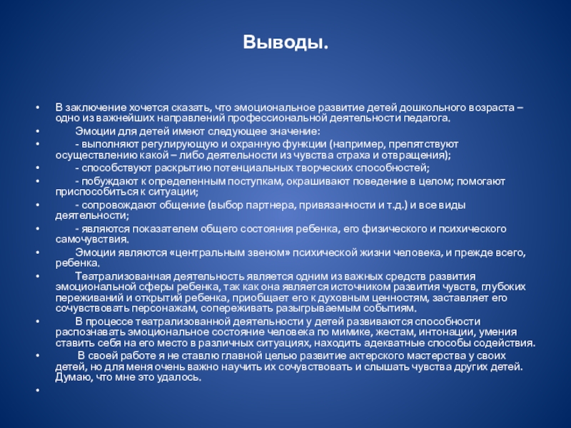 В заключение хочется сказать, что эмоциональное развитие детей дошкольного возраста –