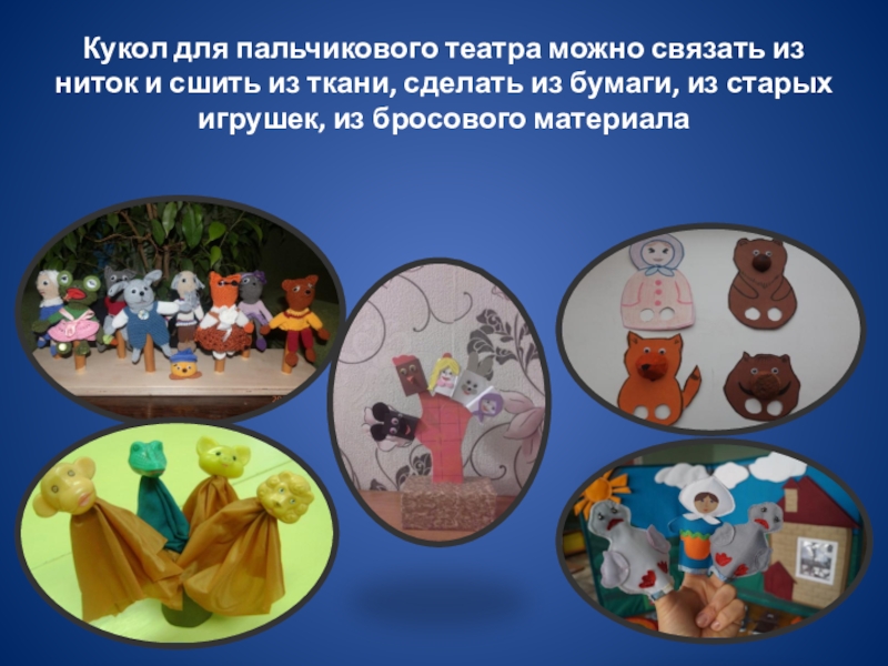Слайд 8Кукол для пальчикового театра можно связать из ниток и сшить из