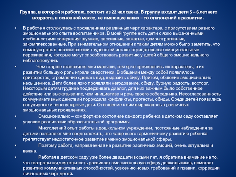 В работе я столкнулась с проявлением различных черт характера, с присутствием разного эмоционального опыта воспитанников. В моей группе есть дети с ярко выраженными особенностями поведения: шумнее, пассивные, зажатые, демонстративные, закомплексованные. При внимательном отношении к таким детям можно было заметить, что немалую роль в возникновении трудностей играют отрицательные эмоциональные переживания, которые могут способствовать развитию у детей общего эмоционального неблагополучия.