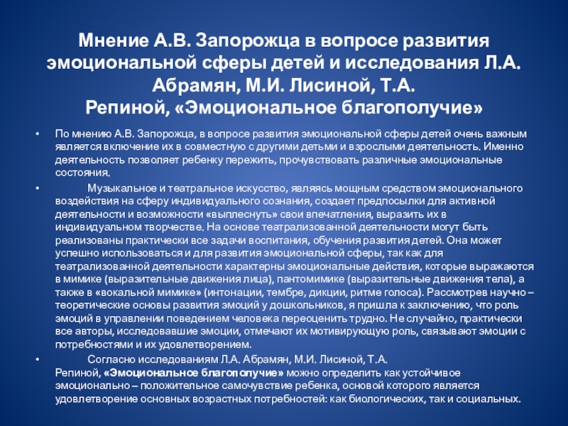 Согласно исследованиям Л.А. Абрамян, М.И. Лисиной, Т.А. Репиной, «Эмоциональное благополучие» можно определить как устойчивое эмоционально – положительное самочувствие ребенка, основой которого является удовлетворение основных возрастных потребностей: как биологических, так и социальных.