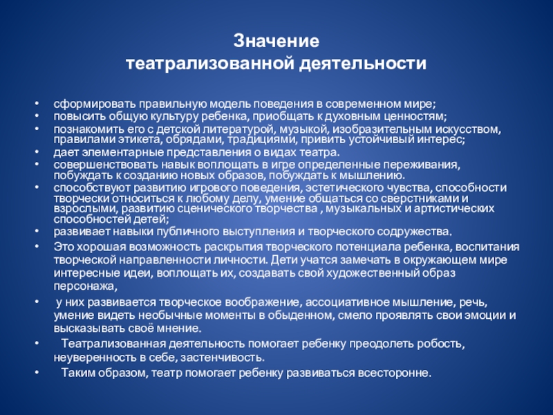 Театрализованная деятельность является одним из важных средств развития эмоциональной сферы ребенка, так как она является источником развития чувств, глубоких переживаний и открытий ребенка, приобщает его к духовным ценностям, заставляет его сочувствовать персонажам, сопереживать разыгрываемым событиям.