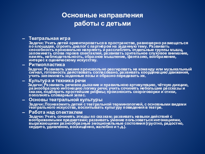 детей ориентироваться в пространстве, равномерно размещаться по площадке, строить диалог с партнёром на заданную тему. Развивать способность произвольно напрягать и расслаблять отдельные группы мышц, запоминать слова героев спектаклей, развивать зрительное слуховое внимание, память, наблюдательность, образное мышление, фантазию, воображение, интерес к сценическому искусству.