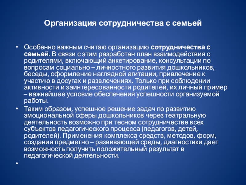Особенно важным считаю организацию сотрудничества с семьей. В связи с