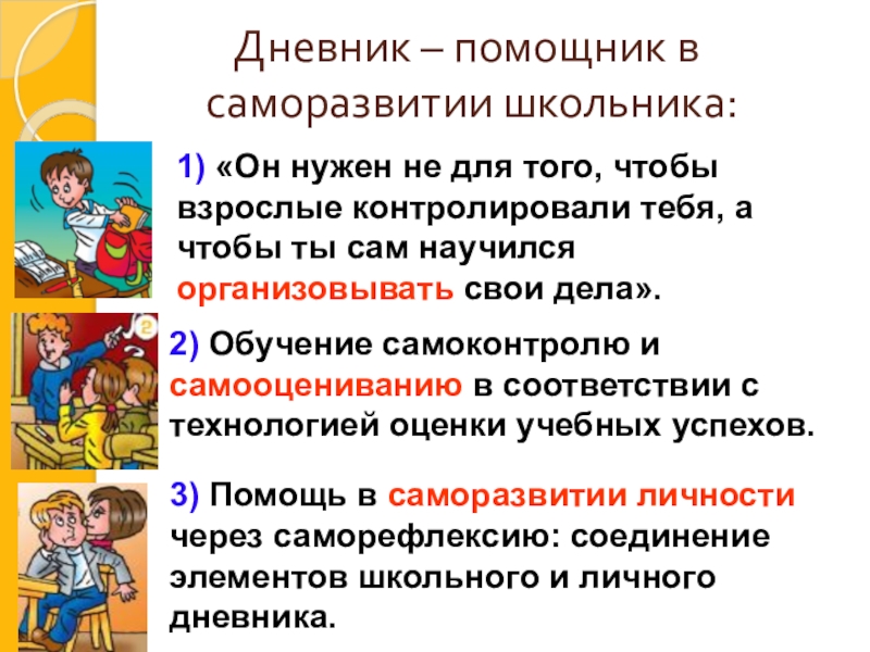 1) «Он нужен не для того, чтобы взрослые контролировали тебя, а чтобы ты сам научился организовывать свои дела».
