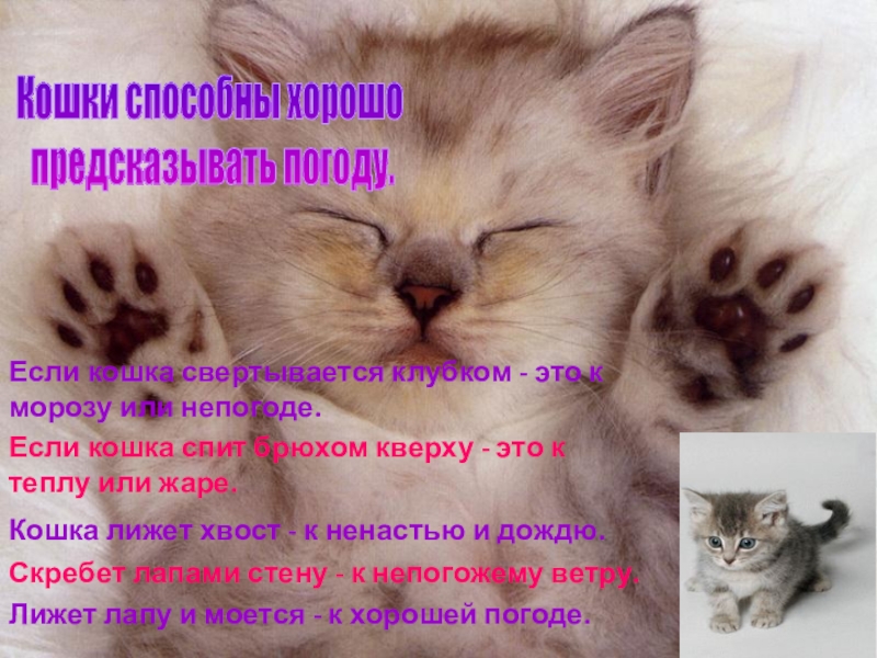 Если кошка спит брюхом кверху - это к теплу или жаре.