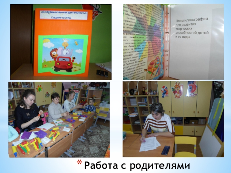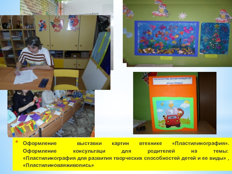 Слайд 19Оформление выставки картин втехнике «Пластилинография». Оформление консультаци для родителей на темы: «Пластилинография
