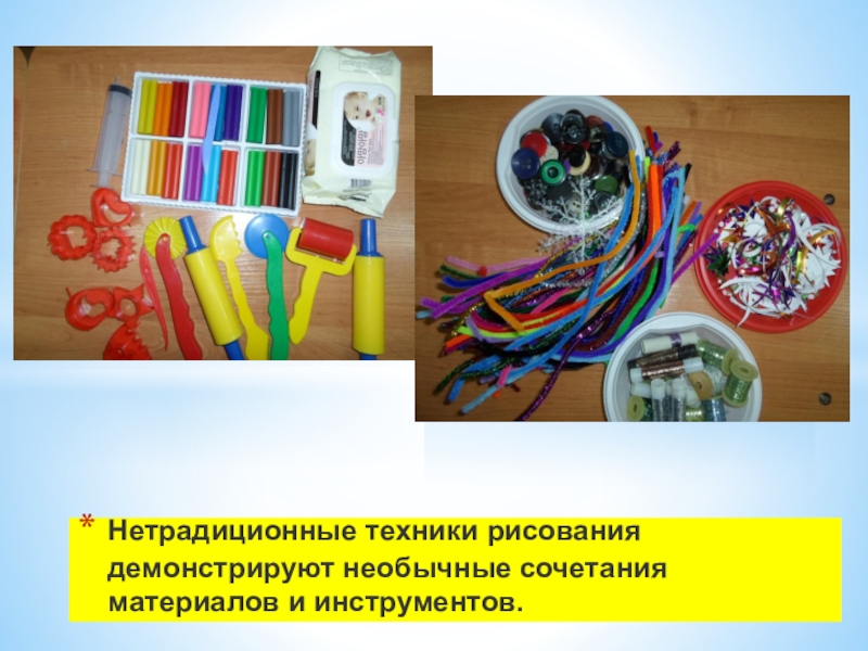 Слайд 14Нетрадиционные техники рисования демонстрируют необычные сочетания материалов и инструментов.