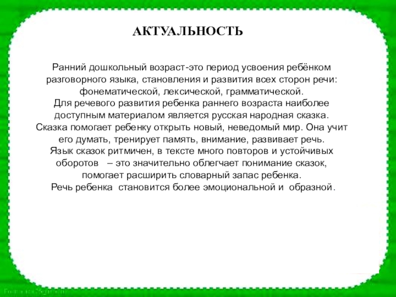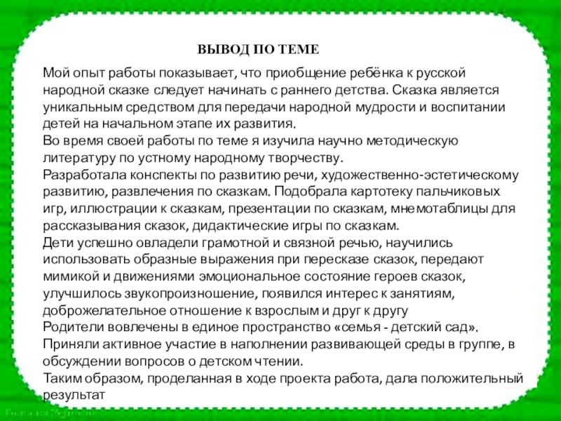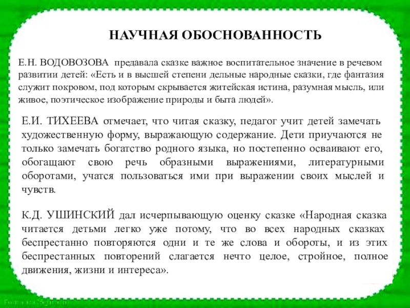 Е.Н. ВОДОВОЗОВА предавала сказке важное воспитательное значение в речевом развитии детей: «Есть и в высшей степени дельные народные сказки, где фантазия служит покровом, под которым скрывается житейская истина, разумная мысль, или живое, поэтическое изображение природы и быта людей».