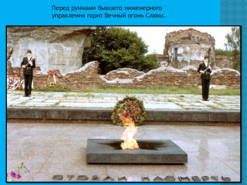 Слайд 8Перед руинами бывшего инженерного управления горит Вечный огонь Славы.