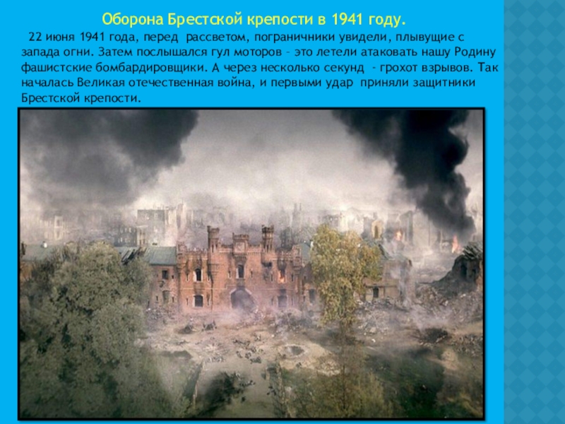 22 июня 1941 года, перед  рассветом, пограничники увидели, плывущие с запада огни. Затем послышался гул моторов – это летели атаковать нашу Родину фашистские бомбардировщики. А через несколько секунд  - грохот взрывов. Так началась Великая отечественная война, и первыми удар  приняли защитники Брестской крепости.