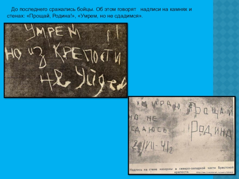 До последнего сражались бойцы. Об этом говорят   надписи на камнях и стенах: «Прощай, Родина!», «Умрем,