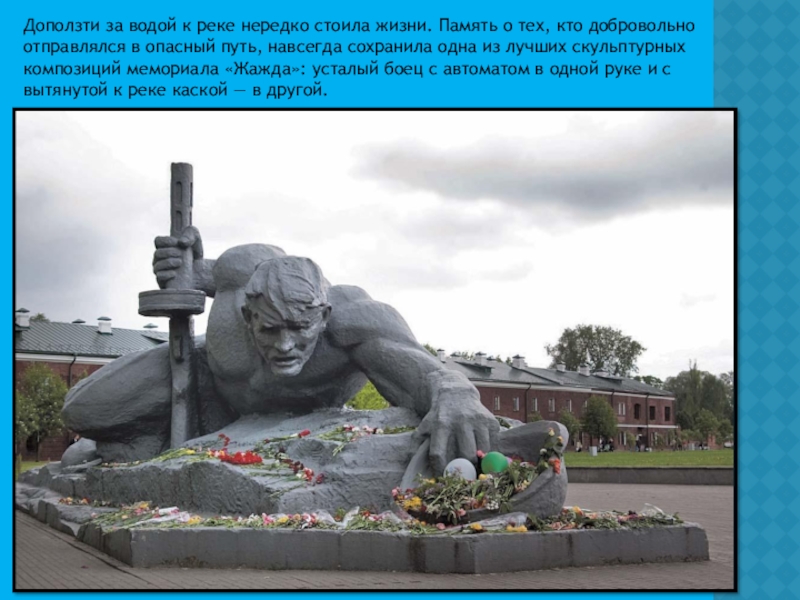 кто добровольно отправлялся в опасный путь, навсегда сохранила одна из лучших скульптурных композиций мемориала «Жажда»: усталый боец с автоматом в одной руке и с вытянутой к реке каской — в другой.