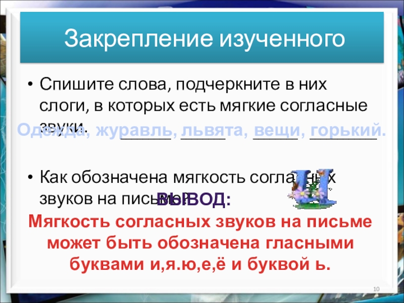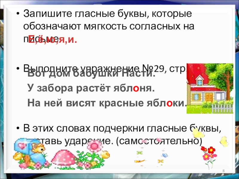 Мягкость согласных звуков на письме может быть обозначена гласными буквами и,я.ю,е,ё и буквой ь.