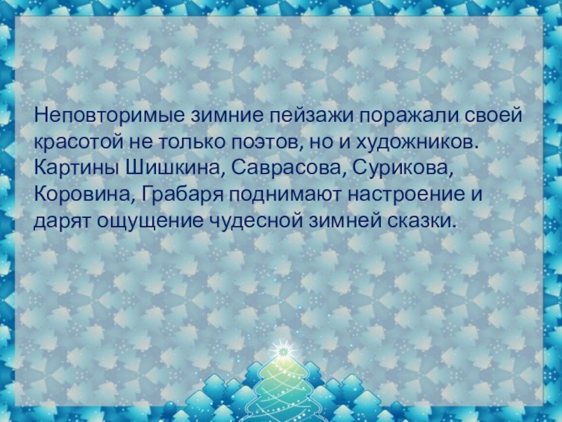 Слайд 11Неповторимые зимние пейзажи поражали своей красотой не только поэтов, но и