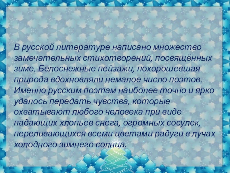 Слайд 2В русской литературе написано множество замечательных стихотворений, посвящённых зиме. Белоснежные пейзажи,