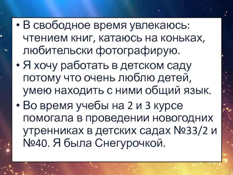 В свободное время увлекаюсь: чтением книг, катаюсь на коньках, любительски фотографирую.Я хочу работать в детском саду потому