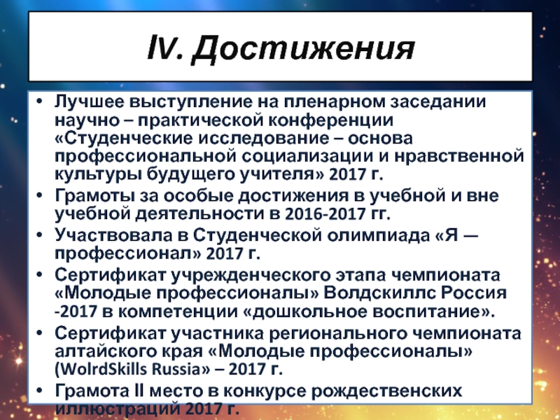 V. ДостиженияЛучшее выступление на пленарном заседании научно – практической конференции «Студенческие исследование – основа профессиональной социализации и