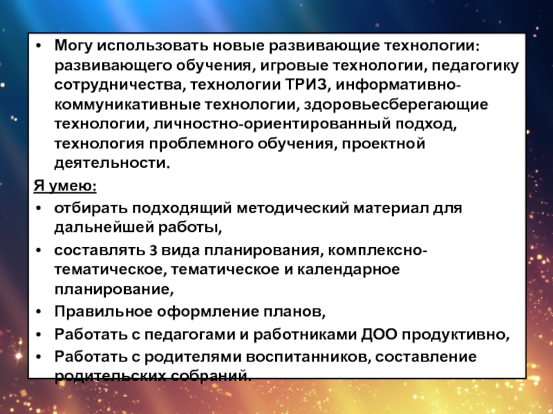 Могу использовать новые развивающие технологии: развивающего обучения, игровые технологии, педагогику сотрудничества, технологии ТРИЗ, информативно- коммуникативные технологии, здоровьесберегающие