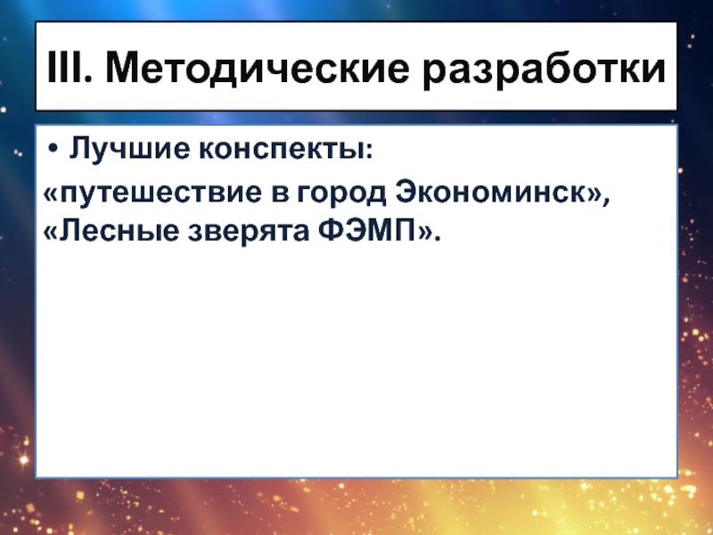 . Методические разработкиЛучшие конспекты:«путешествие в город Экономинск», «Лесные зверята ФЭМП».