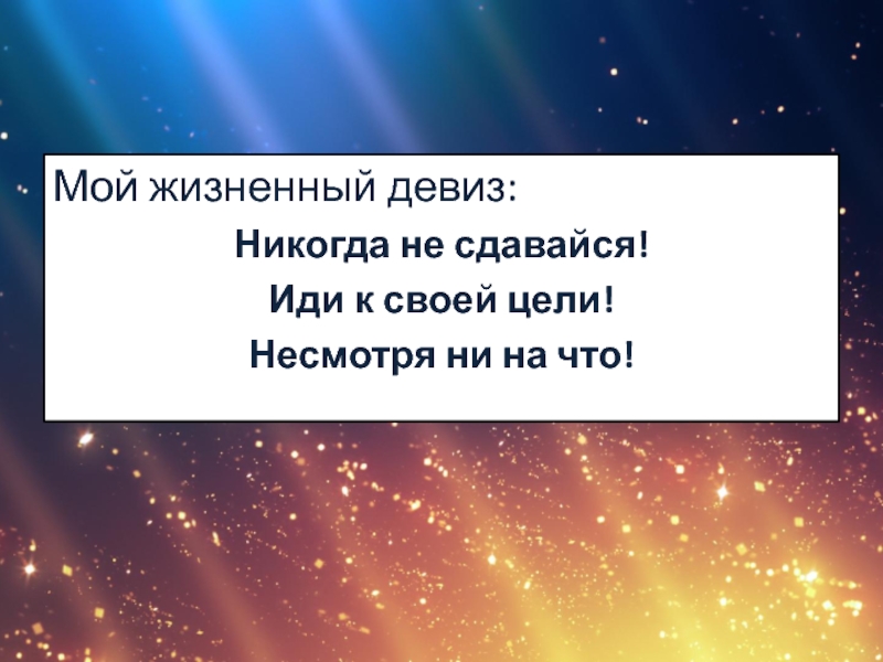 Мой жизненный девиз:Никогда не сдавайся!Иди к своей цели!Несмотря ни на что!