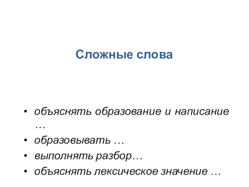 Сложные словаобъяснять образование и написание …образовывать …выполнять разбор…объяснять лексическое значение …