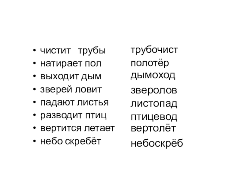 чистит трубынатирает полвыходит дымзверей ловитпадают листьяразводит птицвертится летаетнебо скребёттрубочистполотёрзвероловлистопадптицеводвертолётнебоскрёбдымоход