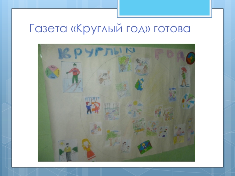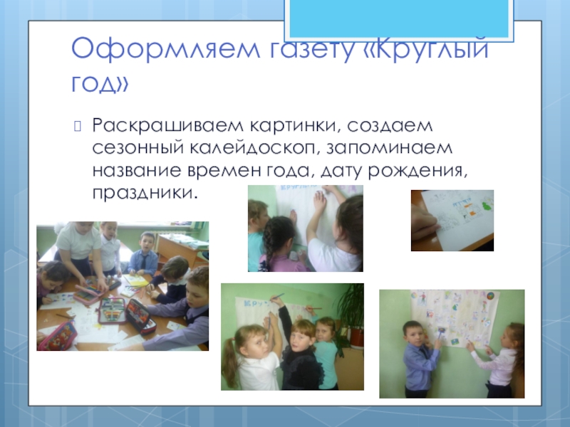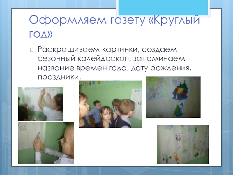 Оформляем газету «Круглый год»Раскрашиваем картинки, создаем сезонный калейдоскоп, запоминаем название времен года, дату рождения, праздники.