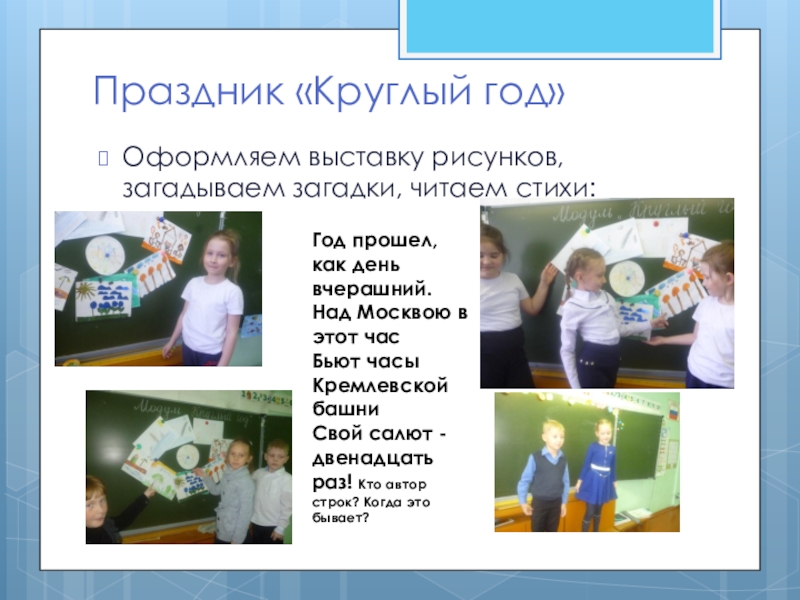 Праздник «Круглый год» Оформляем выставку рисунков, загадываем загадки, читаем стихи:Год прошел, как день вчерашний. Над Москвою в