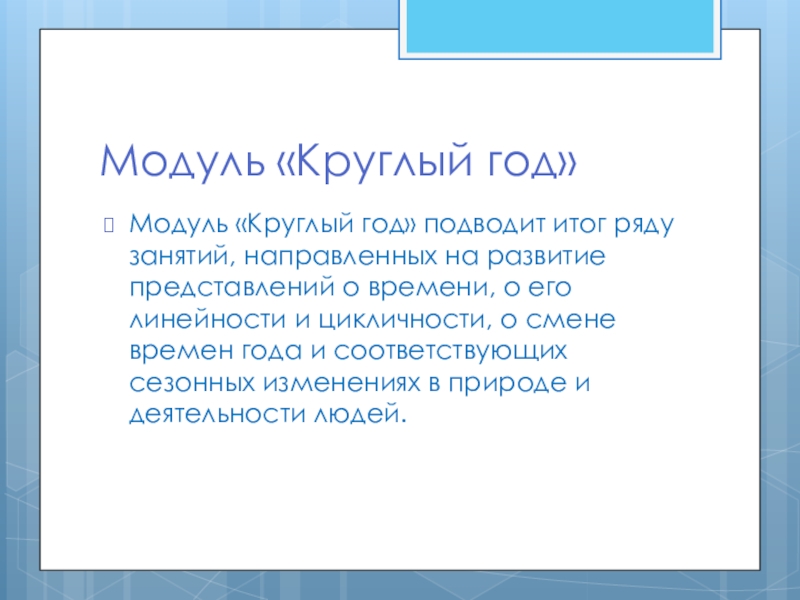 Модуль «Круглый год»Модуль «Круглый год» подводит итог ряду занятий, направленных на развитие представлений о времени, о его линейности и цикличности, о смене времен года и соответствующих сезонных изменениях в природе и деятельности людей.