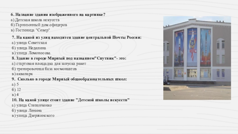 8. Здание в городе Мирный под названием"Спутник"- это: