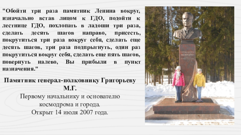 Улица, которая раньше называлась в честь события российской истории, произошедшего 100 лет назад, а сейчас носит название в честь первого начальника космодрома, похороненного у мемориала Вечный огонь