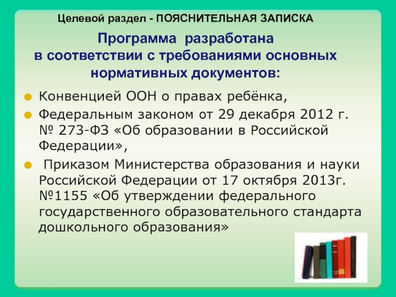 Приказом Министерства образования и науки Российской Федерации от 17 октября 2013г. №1155 «Об утверждении федерального государственного образовательного стандарта дошкольного образования»