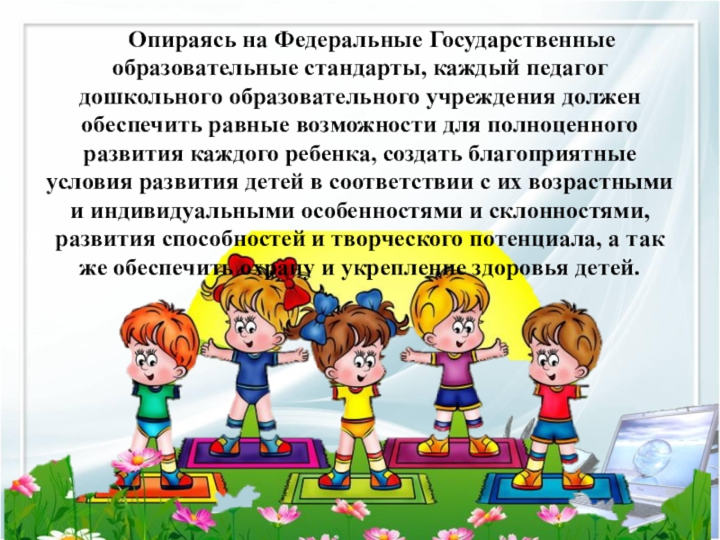 Слайд 2 Опираясь на Федеральные Государственные образовательные стандарты, каждый педагог дошкольного