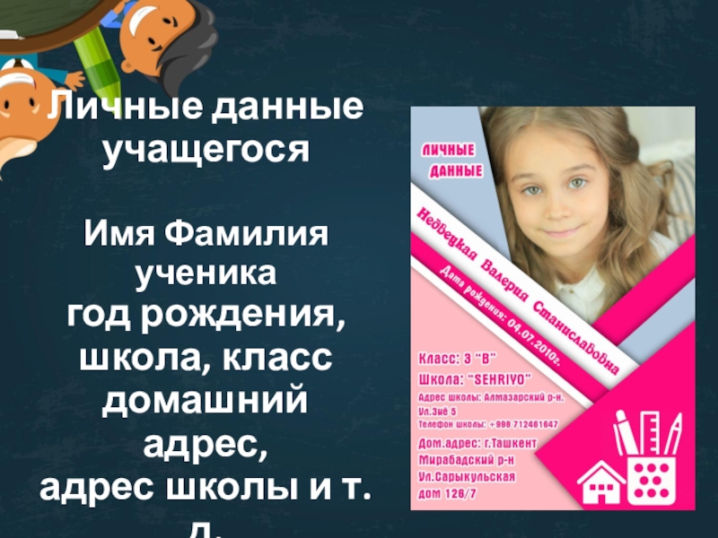 Слайд 3Личные данные учащегося Имя Фамилия ученика год рождения, школа, класс домашний адрес, адрес школы и