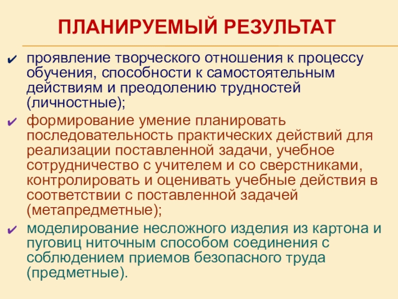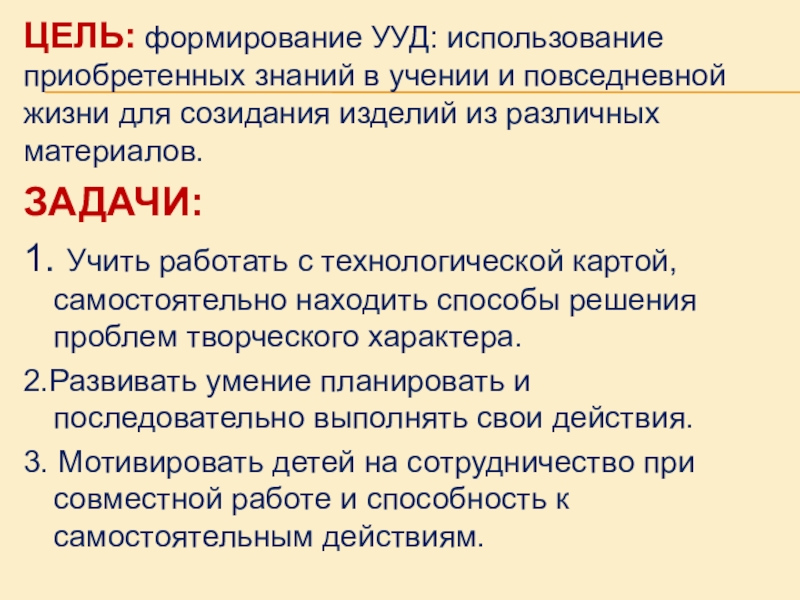 1. Учить работать с технологической картой, самостоятельно находить способы решения проблем творческого характера.