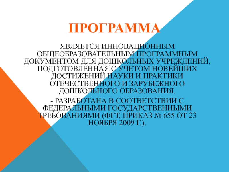 - разработана в соответствии с Федеральными государственными требованиями (ФГТ, Приказ № 655 от 23 ноября 2009 г.).