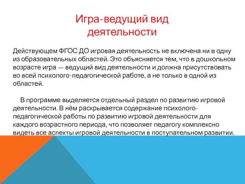 одну из образовательных областей. Это объясняется тем, что в дошкольном возрасте игра — ведущий вид деятельности и должна присутствовать во всей психолого-педагогической работе, а не только в одной из областей.
