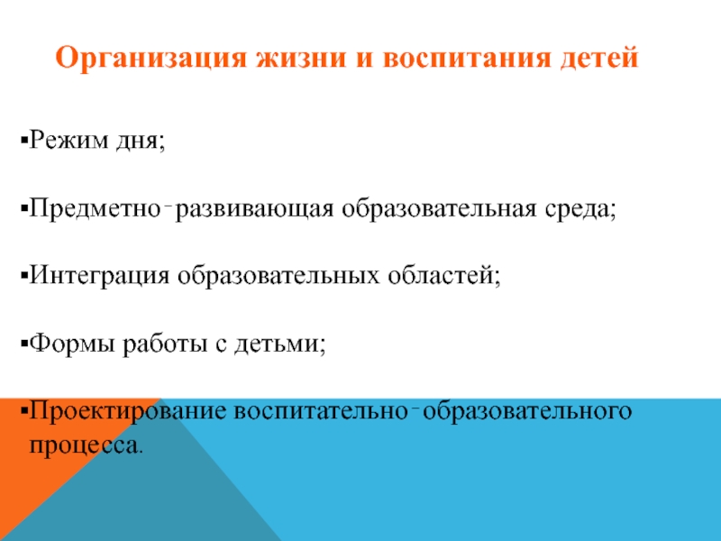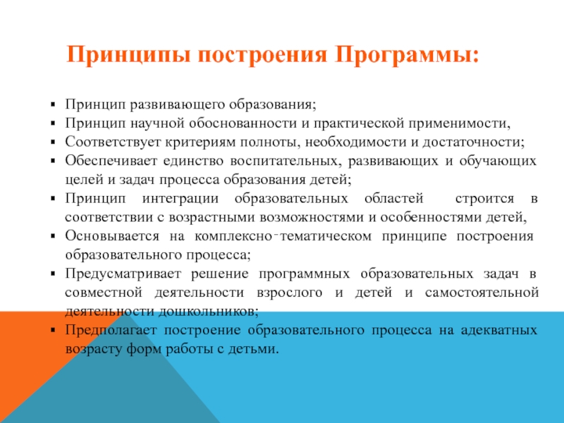 Предполагает построение образовательного процесса на адекватных возрасту форм работы с детьми.