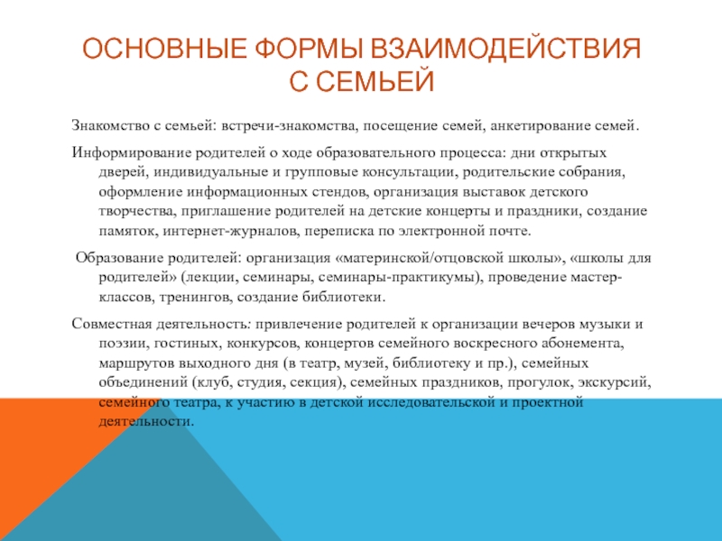 Совместная деятельность: привлечение родителей к организации вечеров музыки и поэзии, гостиных, конкурсов, концертов семейного воскресного абонемента, маршрутов выходного дня (в театр, музей, библиотеку и пр.), семейных объединений (клуб, студия, секция), семейных праздников, прогулок, экскурсий, семейного театра, к участию в детской исследовательской и проектной деятельности.