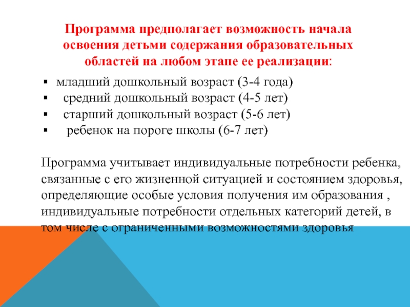 Слайд 13Программа предполагает возможность начала освоения детьми содержания образовательных областей на любом